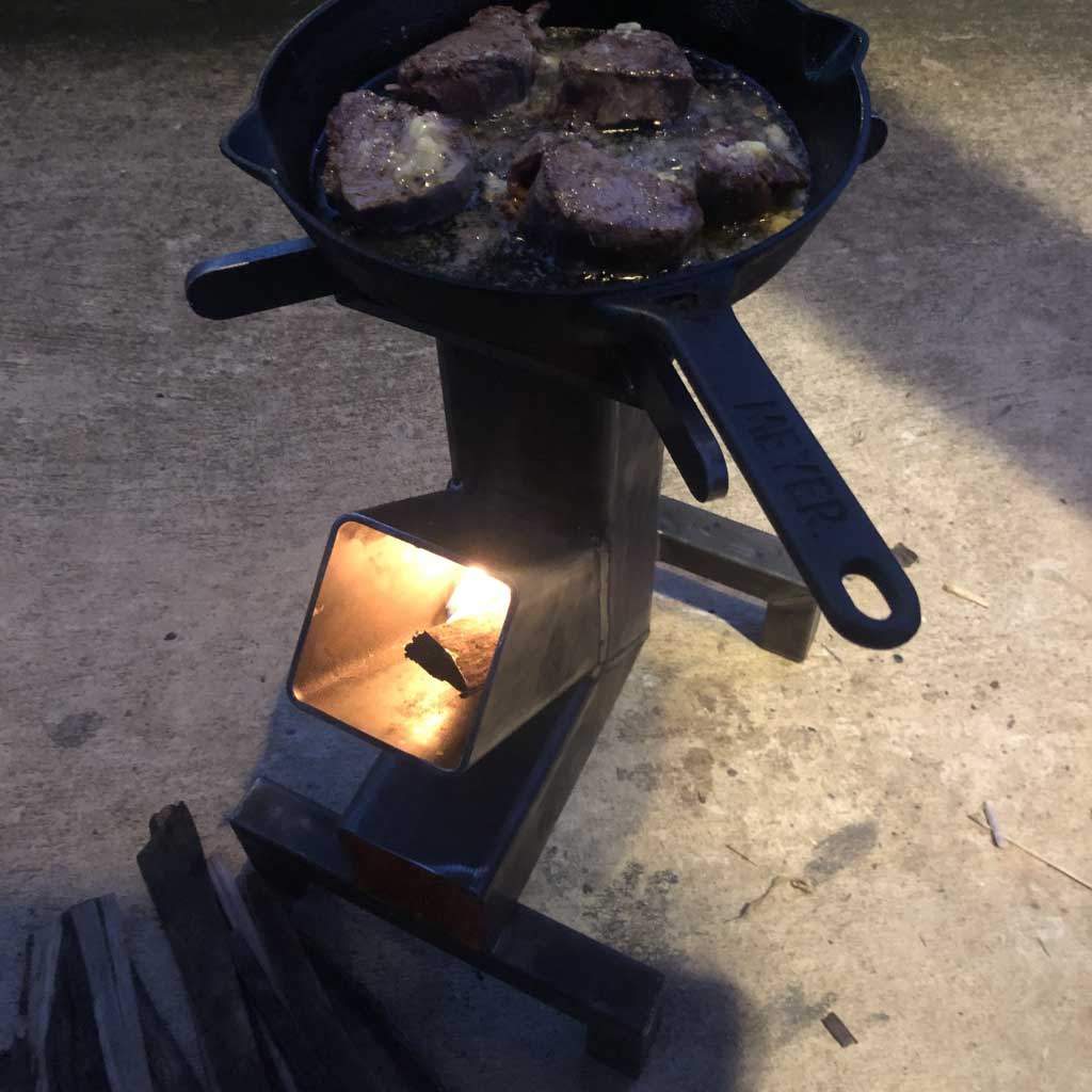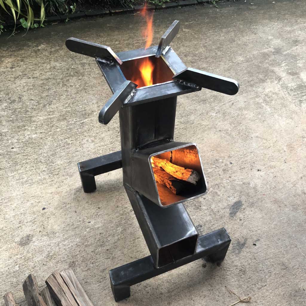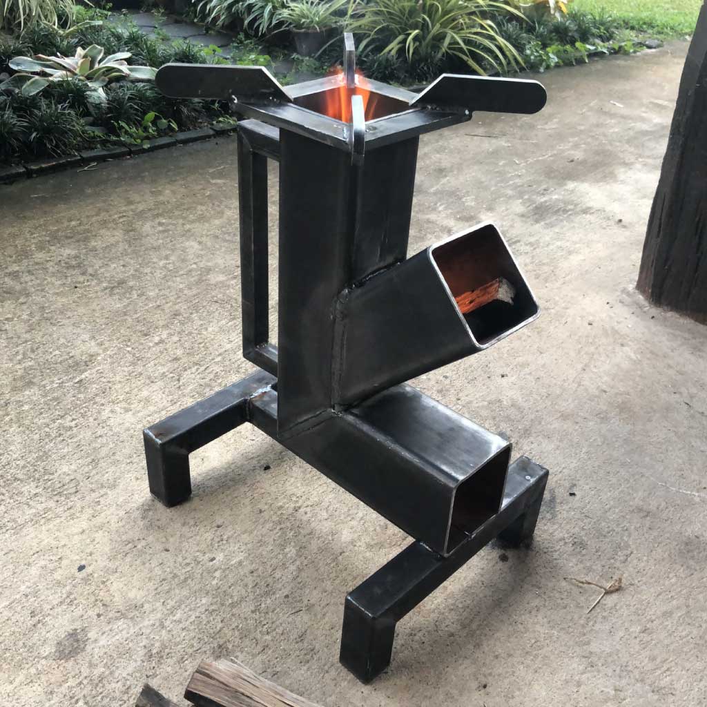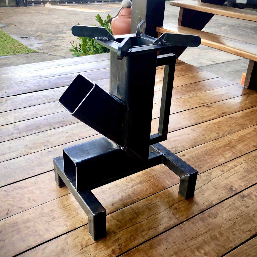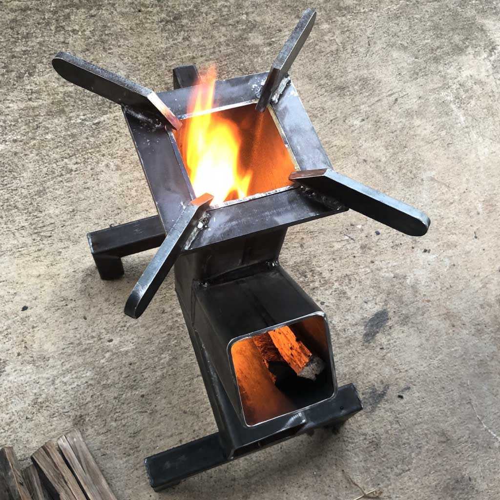 The BBQ-A1 Rocket Stove is the perfect solution for the user that desires maximum cooking power and ease of use. Constructed of 4 mm steel 4″ rectangular tubing, the BBQ-A1 is large enough to generate cooking power on par with a commercial restaurant stove. You can use your typical kitchen sized cookware and up to about a 20 liter pot with no difficulties.